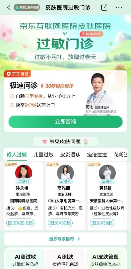 当今,京东互联网病院耳鼻喉中心网罗天下近2000名三甲病院医师,皮肤病院过敏门诊则集聚超3000名皮肤科大家,平均30秒快速接诊。针对春季过敏常陪同的“眼睛痒、打喷嚏、流鼻涕、皮肤起疹”等多系统症状,多学科医师可同表率阅病历、共同制定决策,让用户足不逾户即可完成跨科室商讨,幸免驱驰与交叉感染风险。